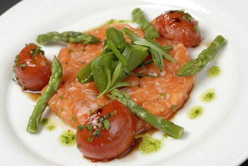- Tartare de saumon aux asperges vertes et tomates acidulées