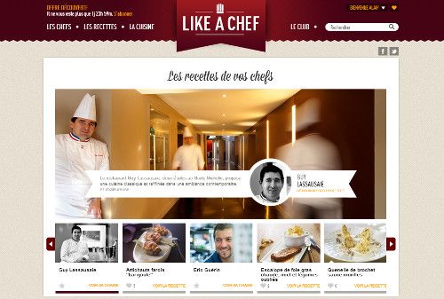 Contrairement à trop de site d’amateurs ou de blogs plus ou moins attractifs, Likeachef.fr, est un site de recettes d’un bel esthétisme, ludique et interactif, et surtout fiable grâce au concours d’une pléiade de grands cuisiniers français qui vous font partager leur vision de la cuisine, leurs créations et leurs tours de main pour réussir, à coup sûr, un repas parfait ; aussi bien pour les repas de tous les jours que pour les grandes occasions.