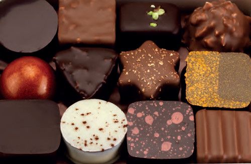 Ganache Lactée, Mon Enfance Lait, Rocher, Pistache, Bahia Fondant, Rosefram fondant, caramel à la violette, café blanc, coco equinoxial fondant, caramel beurre fumé, coulis de cassis, frisson fondant