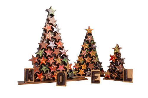 Le sapin existe en 4 tailles. Pur beurre de cacao, chocolat noir 71 % de cacao, Chocolat au lait 32 % de cacao, les étoiles sont garnies d’un praliné fin amandes-noisettes.